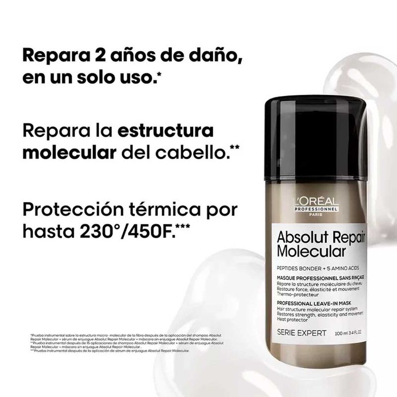 Descubrimiento científico: Absolut Repair Molecular. Repara 2 años de daño en un solo uso*. Por primera vez, la Investigación Avanzada de L’Oréal Investigación Avanzada ha logrado descomponer los péptidos para inyectar sus componentes por separado en la fibra capilar**. Una vez dentro, estos componentes se recomponen y reconstruyen la estructura molecular del cabello***.