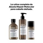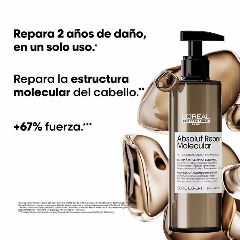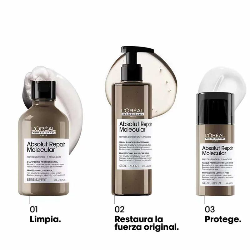 Descubrimiento científico: Absolut Repair Molecular. Repara 2 años de daño en un solo uso*. Por primera vez, la Investigación Avanzada de L’Oréal Investigación Avanzada ha logrado descomponer los péptidos para inyectar sus componentes por separado en la fibra capilar**. Una vez dentro, estos componentes se recomponen y reconstruyen la estructura molecular del cabello***.