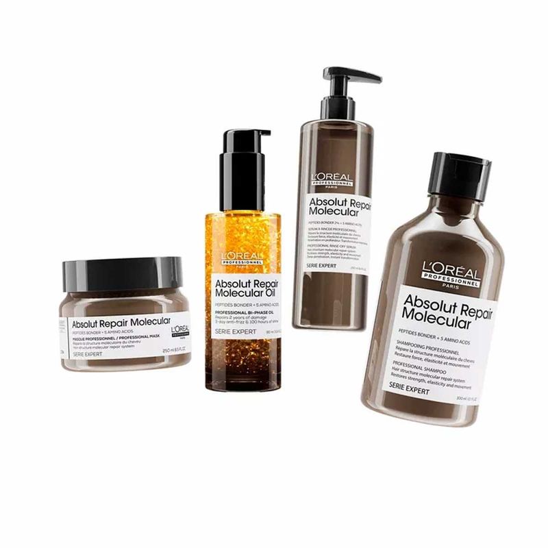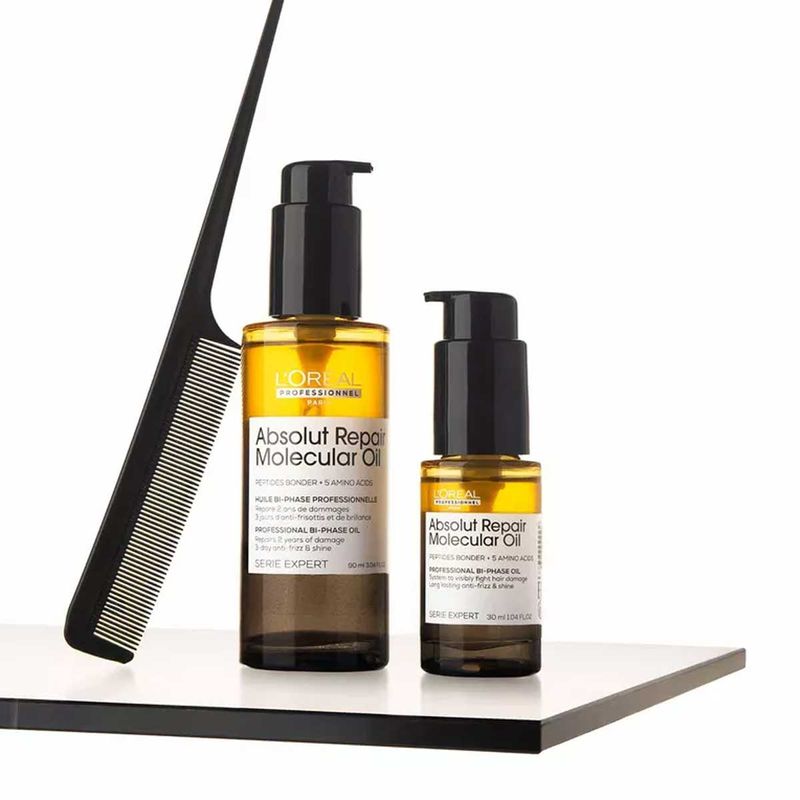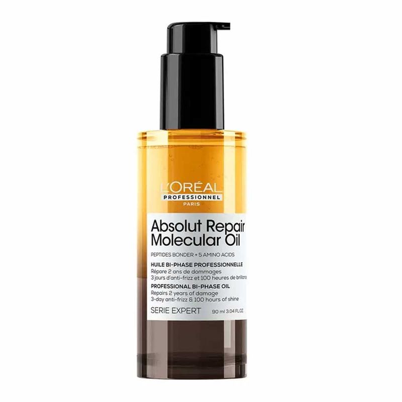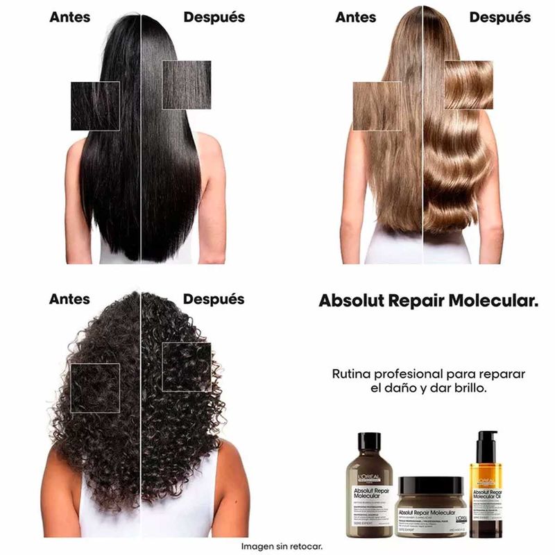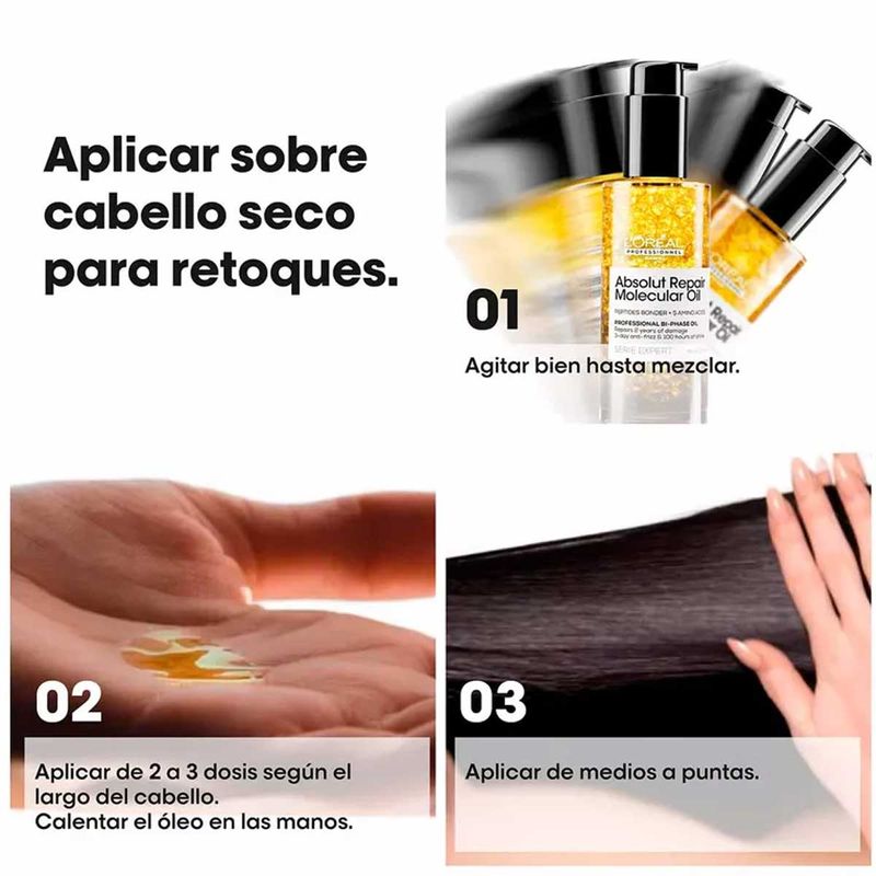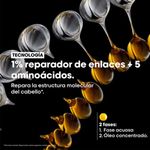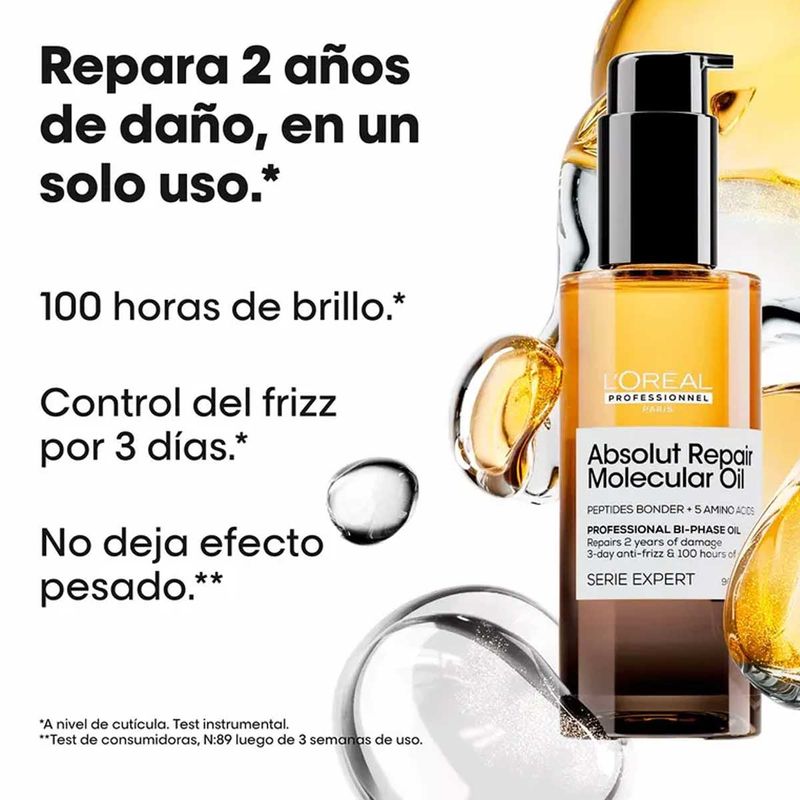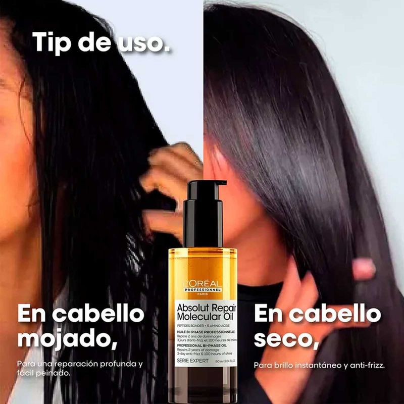 Cuando el cabello se daña, su estructura molecular, compuesta de péptidos, se ve comprometida, haciendo que el daño sea casi irreversible. Absolut Repair Molecular. Repara 2 años de daño, en un solo uso*. Óleo bifásico, formulado con 1% reparador de enlaces + 5 aminoácidos para inyectar sus componentes por separado en la fibra**. Una vez dentro, reparan la estructura molecular del cabello***. Agitar para brillar. Repara 2 años de daño****. 100 horas de brillo*****. Control del frizz por 3 días****. +72% de nutrición******. No deja efecto pesado*******. Óleo bifásico ligero, de rápida absorción con tecnología bifásica para reparar a nivel molecular: 1. Fase acuosa: reparador de enlaces+ 5 aminoácidos para un acabado ligero. 2. Fase oleosa: para reparar la barrera lipídica. Para todo tipo de cabello dañado: cabello con color, decolorado y natural. *Test instrumental a nivel de cutícula, usando shampoo Absolut Repair Molecular + máscara Absolut Repair Molecular + Óleo Absolut Repair Molecular. **Test instrumental. Reparación sobre aspectos visibles del daño. *** Aminoácidos y reparador de enlaces. ****A nivel de cutícula. Test instrumental. *****Test instrumental 100 hs después de la aplicación. ******Test instrumental luego de 72hs de uso del Óleo de Absolut Repair Molecular. *******Test de consumidoras, N:89 luego de 3 semanas de uso.