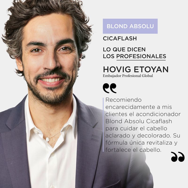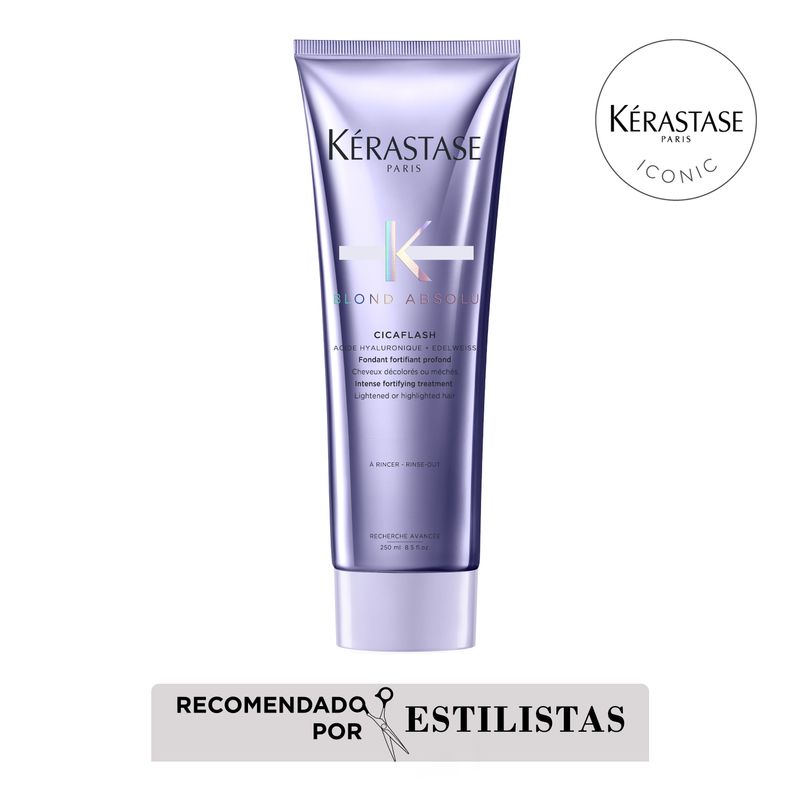 Repara intensamente el cabello sensibilizado, hidratando la fibra. Acondicionador fortificante y anti-quiebre para cabello rubio sensibilizado o dañado.