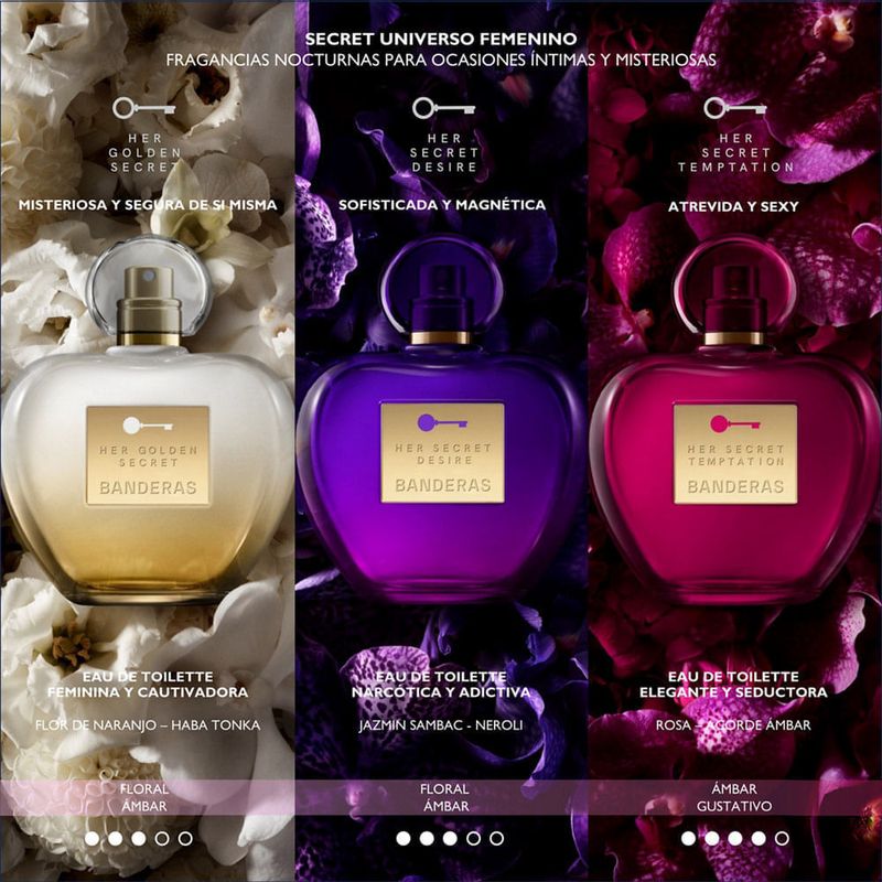 Her Secret Temptation de Antonio Banderas es el perfume que invita a caer rendida ante los deseos más secretos. Los suculentos cítricos junto con la personalidad única de las especias ganan en sensualidad y carácter a través de los elegantes toques de la madera. The Secret Temptation nos tienta desde el primer momento con su lujosa atracción. ¿Te atreves a rendirte a ella?