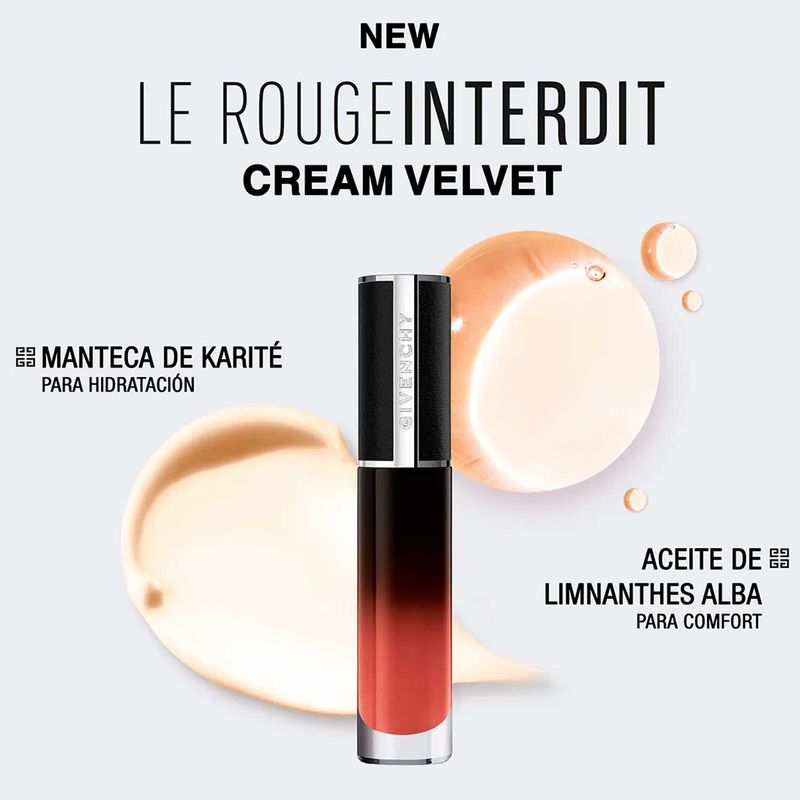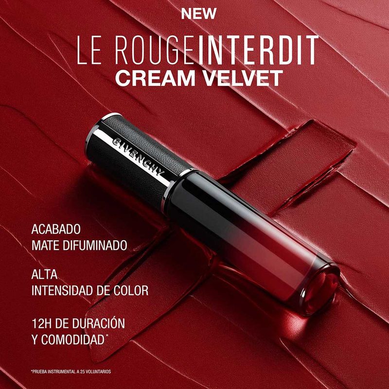 Una nueva declaración de color. Descubi el efecto difuminado de Givenchy con Le Rouge Interdit Cream Velvet, el nuevo labial en crema mate con color de alto impacto. Ofreciendo 12 horas de hidratación, la fórmula ultrasensorial envuelve los labios en 12 horas de comodidad. Le Rouge Interdit Cream Velvet es el labial líquido en crema de Givenchy que combina una película aterciopelada imperceptiblemente ligera con un increíble color.