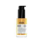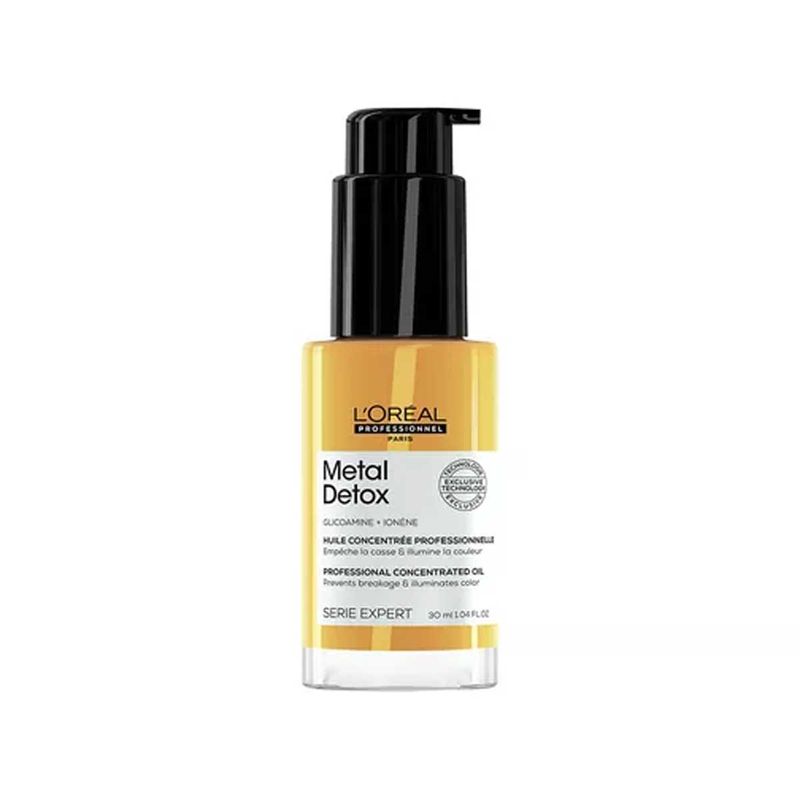 DESCUBRIMIENTO CIENTÍFICO. El metal presente en el agua, que penetra en el cabello lavado tras lavado, es una de las principales causas del quiebre y el cambio del color del cabello. Puede dañar la fibra capilar, provocar tonos indeseados y afectar negativamente la calidad del color. TECNOLOGÍA EXCLUSIVA El aceite concentrado Metal Detox fortalece el cabello y lo protege del depósito de partículas. Está potenciado con Glicoamina, un agente quelante lo suficientemente pequeño como para penetrar en la fibra, atrapar el metal y neutralizar su efecto. Este aceite concentrado forma parte de la gama Metal Detox, un protocolo completo anti-metal para prevenir el quiebre y el cambio de color. -97% DE QUIEBRE DEL CABELLO, EN 1 GOTA. El cabello queda más fuerte, con un 97% menos de quiebre, con solo 1 gota. Cabello 2 veces más nutrido. El cabello tiene más cuerpo y disciplina. COLOR VIBRANTE. El cabello es 2 veces más brillante sin una capa grasa y el color se ve más intenso. Se mejora el contraste del color. PROTECCIÓN CONTRA EL FRIZZ Y EL CALOR: 4 veces más control del frizz y protege del calor hasta 230°C FÓRMULA PROFESIONAL: Acabado ligero y no graso. Una fragancia con una firma tecnológica única, gracias a una memorable nota de salida cítrica asociada a distintivas maderas almizcladas. Para una experiencia Metal Detox óptima en casa, utilizar el shampoo en crema limpiador anti-metal Metal Detox para eliminar suavemente las partículas metálicas, luego continuar con la máscara protectora Metal Detox para proteger la fibra de nuevos depósitos de partículas, y la crema de alta protección o el aceite concentrado Metal Detox para fortalecer la fibra. RECOMENDADO PARA TODO TIPO DE CABELLO. Para todo tipo de texturas de cabello, teñido, dañado, decolorado y natural. Pruebas instrumentales. Prueba instrumental con shampoo + máscara + aceite Metal Detox .Prueba instrumental después de 12 aplicaciones del shampoo Metal Detox.