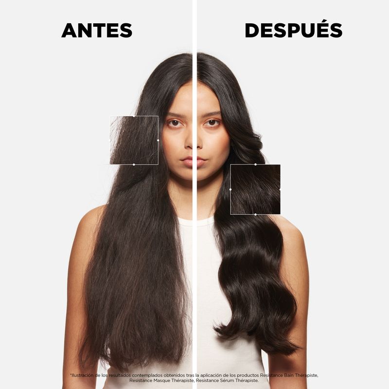 Doble sérum renovador y sellador de medios y puntas extremadamente dañadas. Proporciona protección térmica al cabello de hasta 230ºC además de ligereza y suavidad. Compensa la pérdida de KAPs en el cabello (Proteínas Asociadoras de Keratina que se encuentran en el córtex), neutralizando la pérdida de materia.